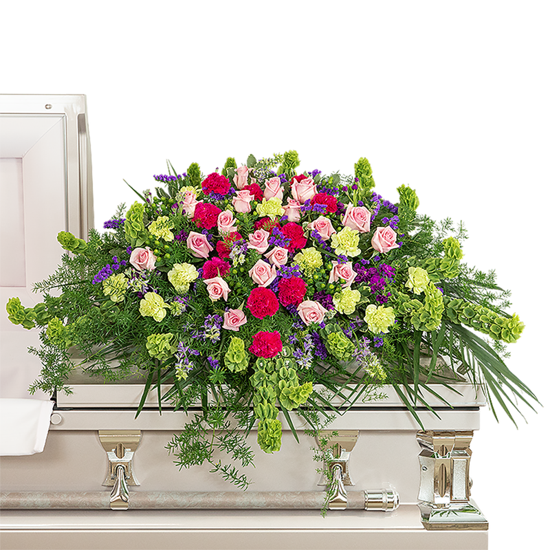 Our Always Remembered Casket Spray is a gorgeous design for the casket with bright pinks, purples, and greens. The bright colors in this design are accomplished with roses, Bells of Ireland, Hot Pink, and green Carnations, Hypericum Berries, Larkspur, Statice, and other premium foliage. The casket spray or family flowers are typically provided by the spouse or immediate family as a heartfelt memorial from the family and is designed to sit on the lid of the casket for a funeral service or memorial.