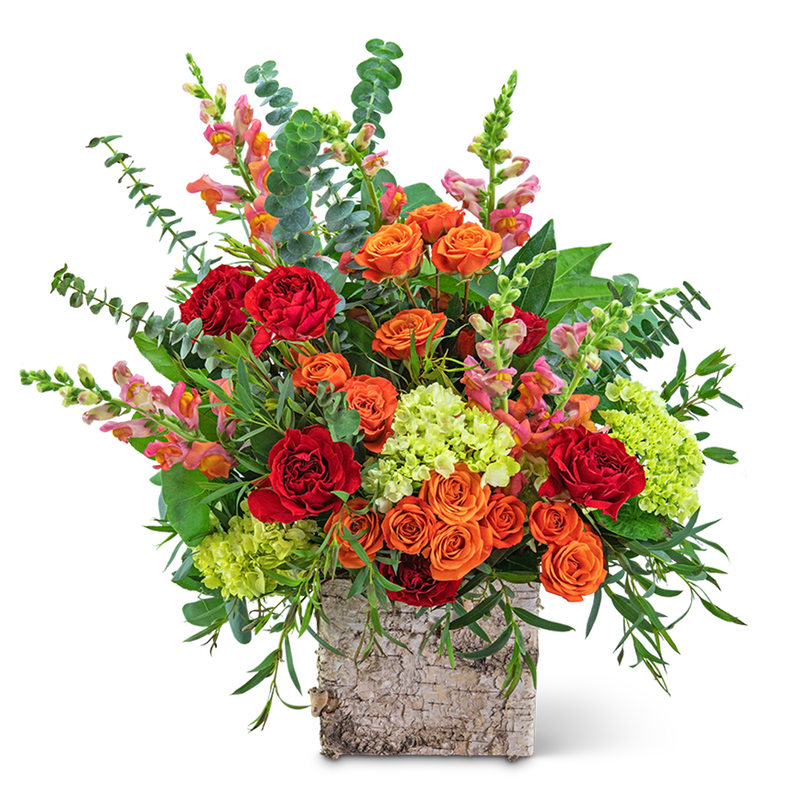 Put a song in someone's heart with this colorful bouquet of vibrant reds, oranges, and pinks! Aspen Symphony features roses, snapdragons, hydrangea, eucalyptus, and parvifolia in a charming birch box. This stunning arrangement will make quite an impression on any entryway or dining room table.