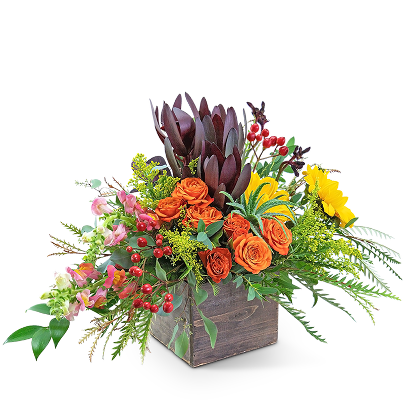Bring happiness to someone's day by sending Aurora Moment. This bright design features sunflowers, snapdragons, hypericum berries, spray roses, leucodendron, and assorted foliage in a modern wooden box. Show you care by sending flowers, the perfect birthday or get well gift.