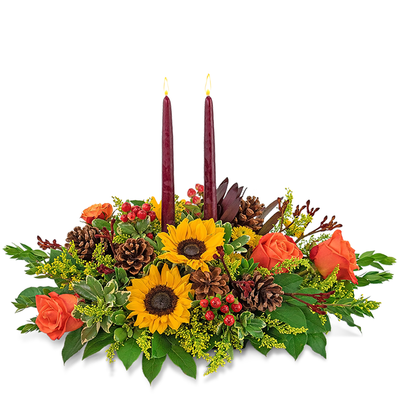 Our Autumnal Abundance Centerpiece will bring warmth and beauty to any holiday table or Thanksgiving celebration. This fresh centerpiece features bright sunflowers, button spray mums, orange roses, hypericum berry, solidago, pinecones, and other premium foliage gathered around two elegant tapered candles. Fresh flowers are the perfect complement to your Thanksgiving tablescape.