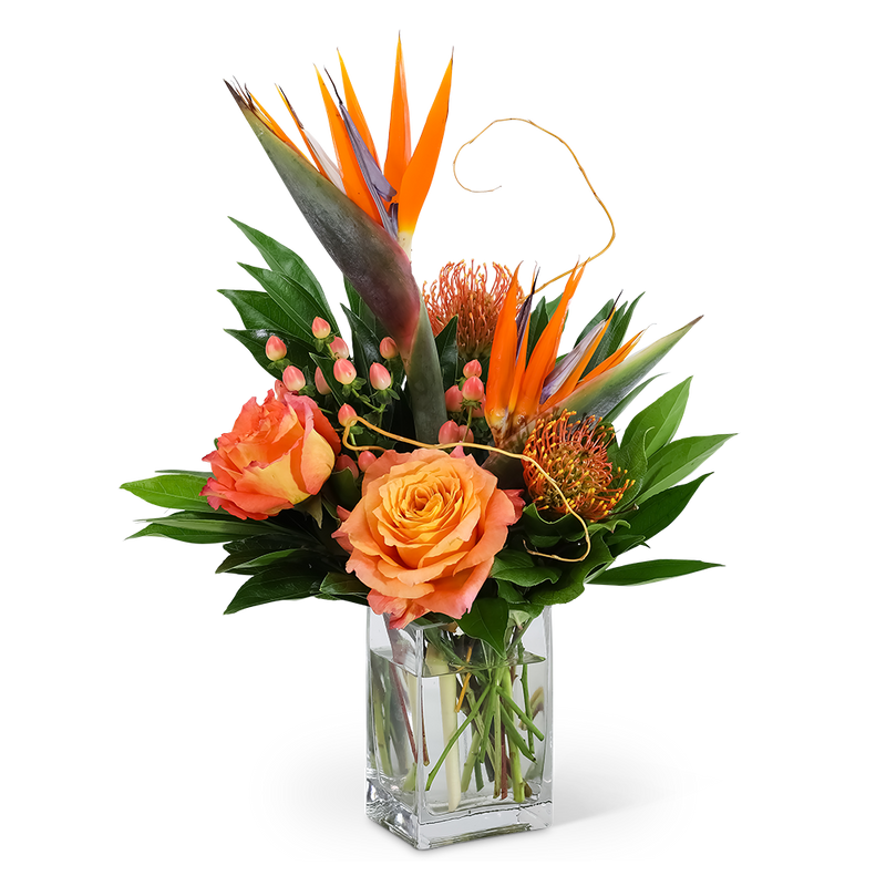 Is there anything better than a warm day in the tropics? What better way to spread warmth than to send Bali Spirit to a friend or loved one? This design features unique Birds of Paradise, pincushion protea, free spirit roses, hypericum berry, curly willow, and premium greens. All of these elements combine to create a true Bali spirit!