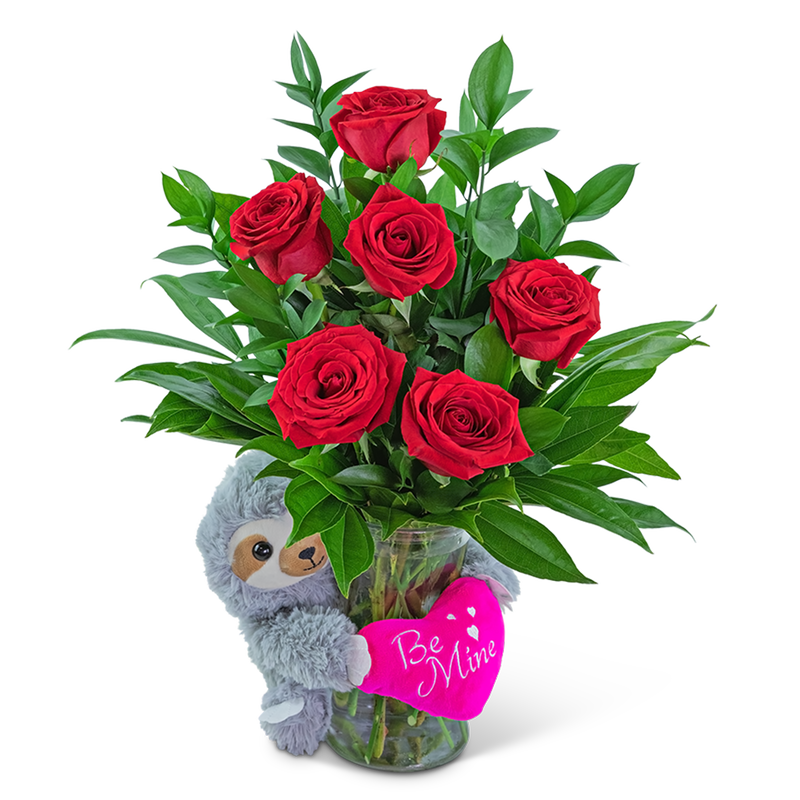 The Be Mine Classic has six red roses adorned with a variety of premium foliage in a clear gathering vase. The arrangement is hugged by an adorable plush Sloth who is sure to bring a big smile to anyone's face! *Select items may vary based on availability