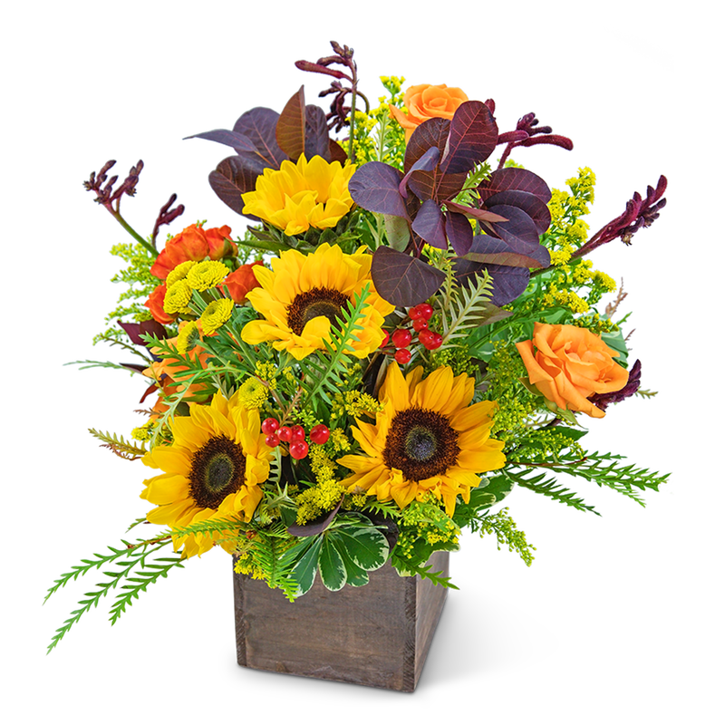 Your loved one will feel like a star when they receive this gorgeous bouquet! Beachwood Canyon creates a golden glow with roses, sunflowers, kangaroo paw, button spray mums, hypericum berry, solidago, leucodendron, grevelia, and variegated pittosporum arranged in a modern wooden box. This large arrangement would make quite a statement on an entryway or dining room table.