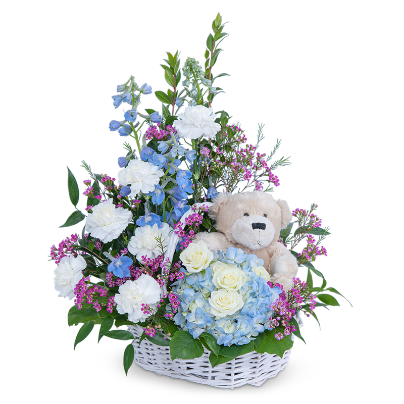 Beary Lovable is the perfect new baby gift. It features spray roses, Carnations, Hydrangea, Delphinium, Waxflower, other premium foliage, and a keepsake stuffed bear tucked sweetly into a classic white basket. Beary Lovable is a gift for both the new parents and the baby to enjoy.