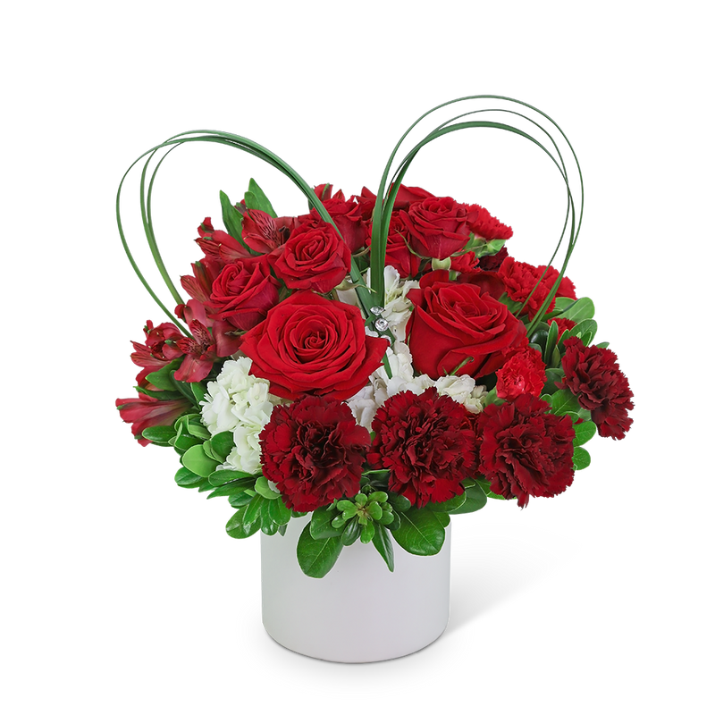 Beating Heart is a very romantic gift! This fresh flower design is created with roses, alstroemeria, and carnations in a white vase. Whether you're looking for a gift for your Valentine or just to show someone how much you care, this design made up of red and white blossoms with a natural foliage heart accent makes it an exceptional gift for Valentine's Day. Whether you're looking for a gift for your Valentine or just to show someone how much you care, this romantic bouquet will surely convey your feelings.