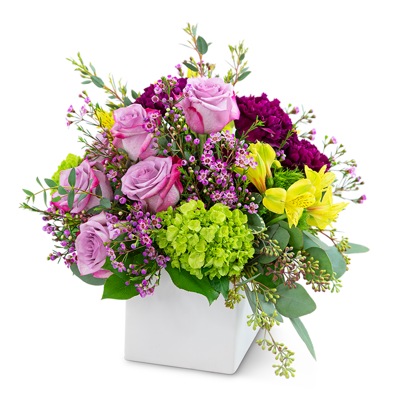What is the perfect gift to show someone you care? A luxurious floral arrangement, hand delivered to her door will always bring a smile. Our Bel Air Beauty design features long-lasting Alstroemeria, purple carnations and roses, hydrangea, premium foliage, and is accented with wax flower. Bel Air Beauty will look perfectly ritzy and bright on a coffee table, counter top, or desk.
