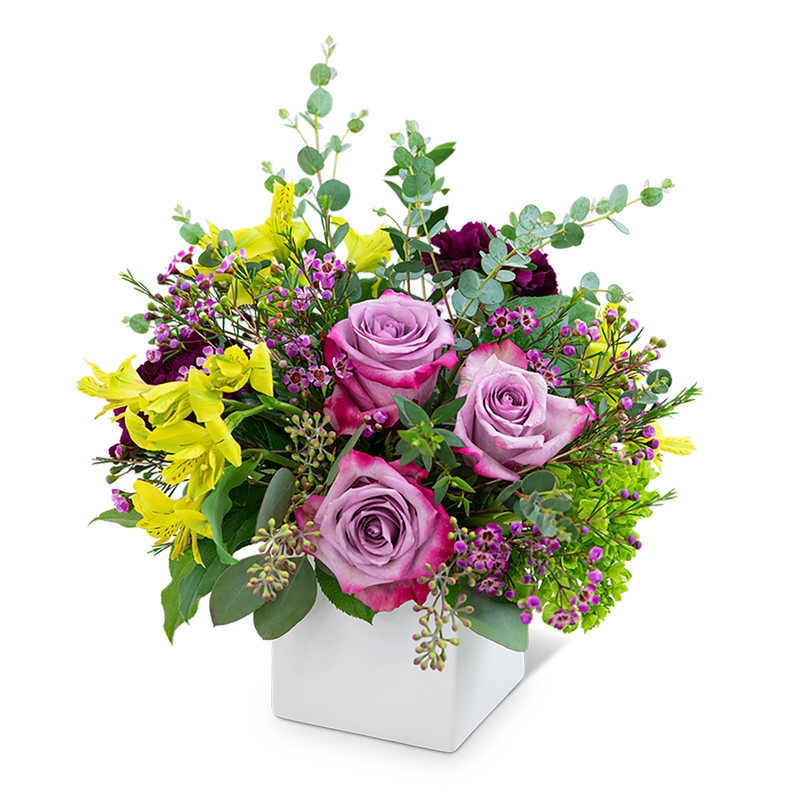 What is the perfect gift to show someone you care? A luxurious floral arrangement, hand delivered to her door will always bring a smile. Our Bel Air Bright design features long-lasting Alstroemeria, purple carnations and roses, hydrangea, premium foliage, and is accented with wax flower. Bel Air Bright will look perfectly ritzy and bright on a side table or desk.