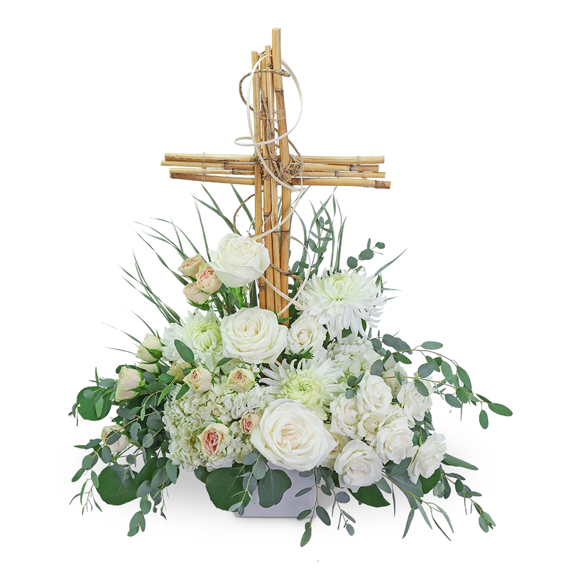 Our Blessed Assurance design perfectly symbolizes a loved one's faith-filled life on earth. It also makes a beautiful table centerpiece for Easter or Christmas. Traditional roses, contemporary mums, and playful hydrangea mix to create a stunning bouquet! A rustic cross made of Rivercane makes this design a timeless beauty! Sympathy flowers are the perfect way to honor life or send your condolences to the grieving family.