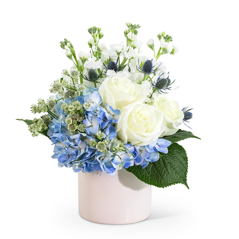 How do you show someone you care about them? Having Bliss Garden delivered to their door is a fail-proof way to show your love and appreciation. Everyone around will appreciate the beauty and fragrance of this magnificent floral design. This refreshing floral arrangement features long-lasting white roses, hydrangea, stock, astrantia, and eryngium. Bliss Garden is the perfect gift for a birthday, get well, or new baby present to make your loved one feel extra special.