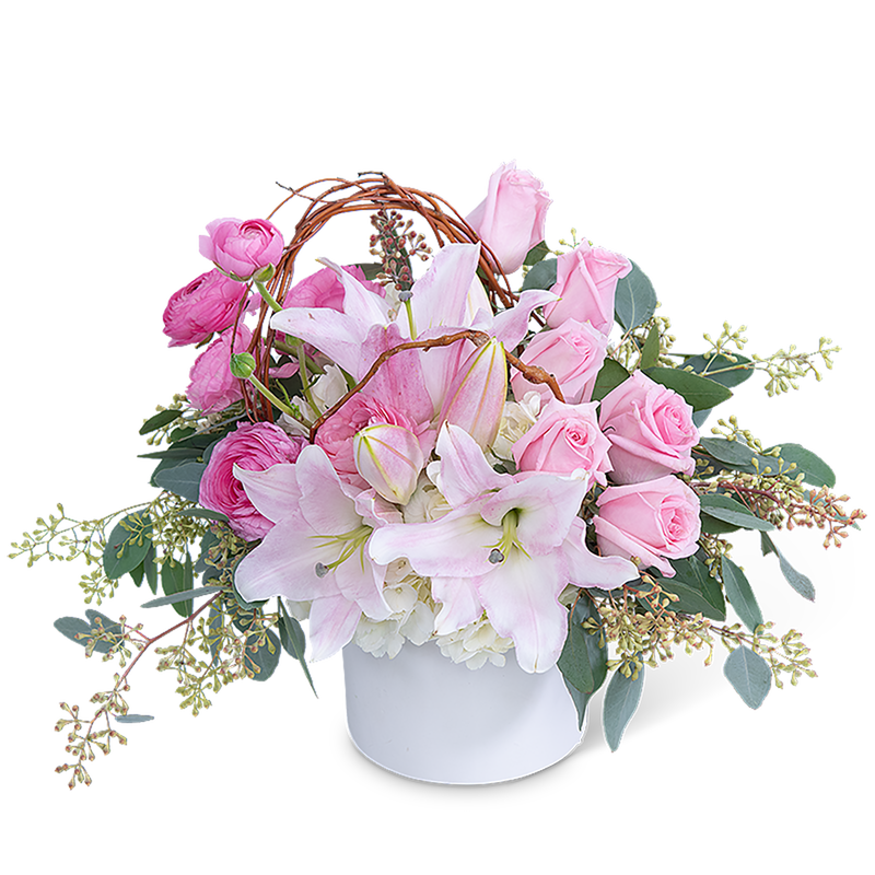 Celebrate the one you love by sending this beautiful and cheerful design. Blush and Beauty features delicate pink roses, lilies, hydrangea, and Ranunculus, with a whimsical curly willow accent. It's the perfect gift for any occasion and will make someone's week, as it will have long-lasting blooms, brightening their home or office space.