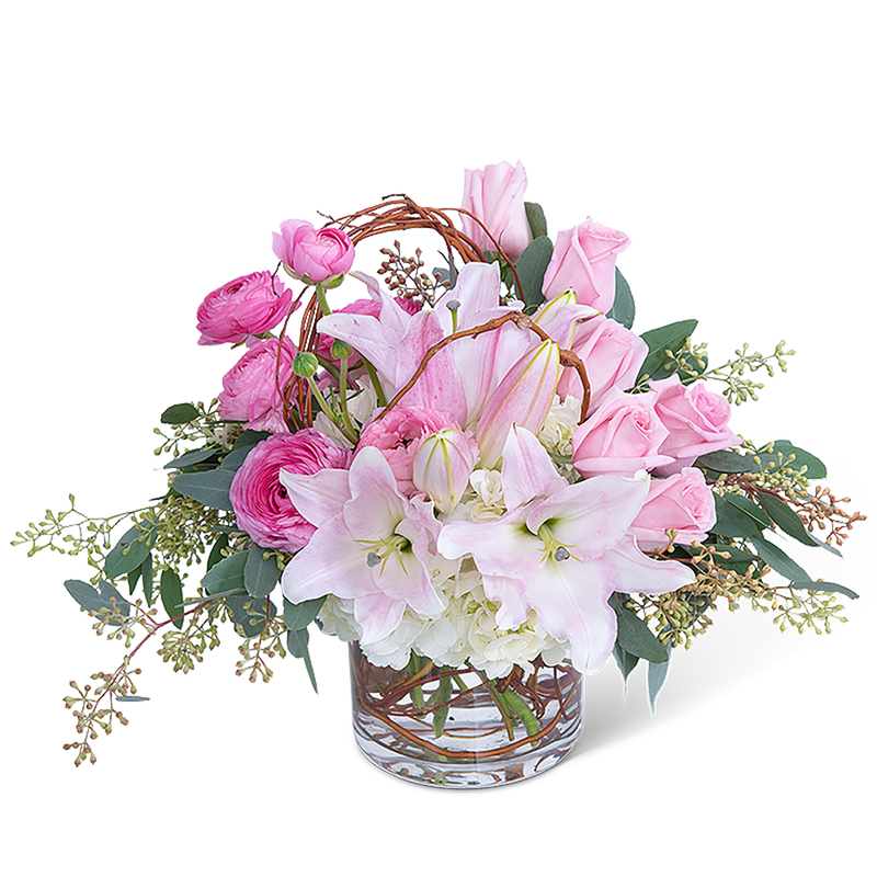 Celebrate the one you love by sending this beautiful and cheerful design. Blush and Willow features delicate pink roses, lilies, hydrangea, and Ranunculus, with a whimsical curly willow accent. It's the perfect gift for any occasion and will make someone's week, as it will have long-lasting blooms, brightening their home or office space.