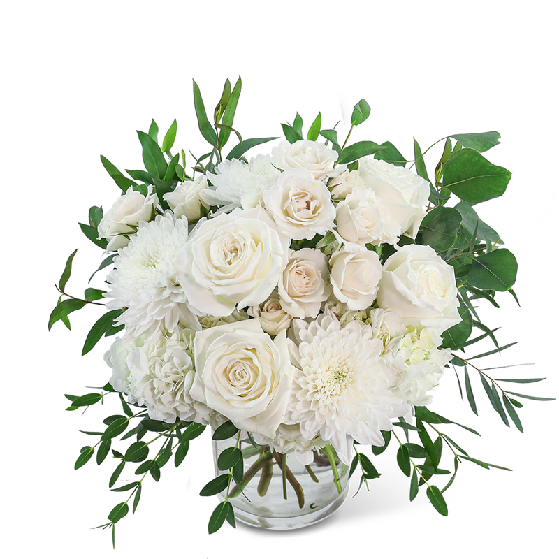 Blush Charm is an exquisite floral arrangement featuring roses, hydrangea, Cremons, and premium foliage in a clear glass vase. As your local florist offering reliable flower delivery, this arrangement of white and green flowers is the perfect gift to commemorate a birthday or anniversary, exuding beauty and sophistication.