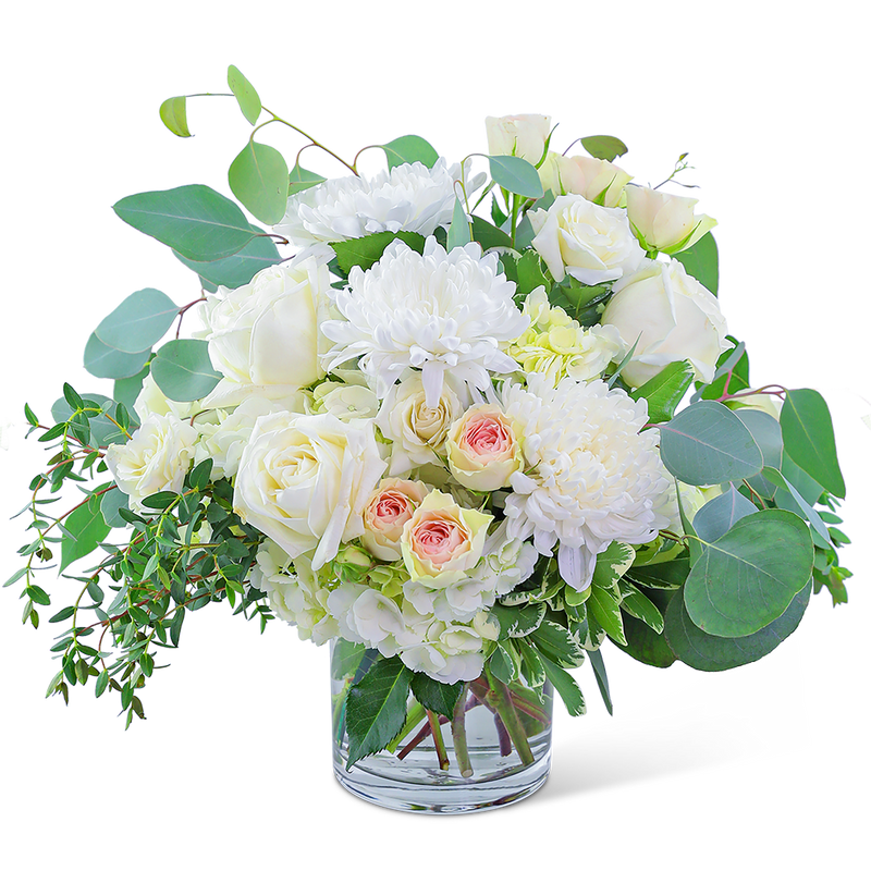 Awaken the senses as you walk into your own romantic floral fantasy! Traditional roses, contemporary mums, and playful hydrangea mix to create a stunning bouquet! Blush Garden is bursting with blossoms and arranged in an eye-catching clear glass vase, accented with premium foliage. A shop favorite, this timeless beauty is perfect for any occasion!