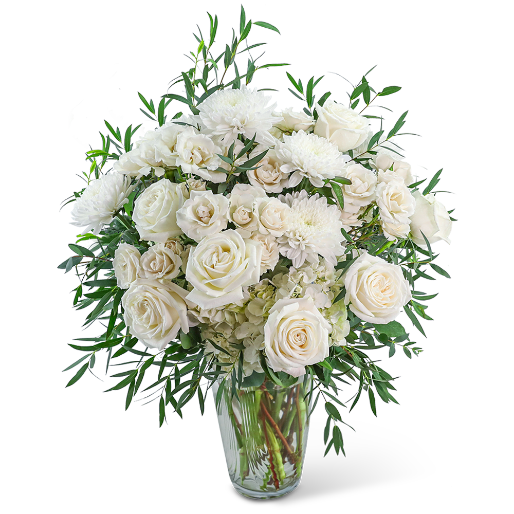 Blush Luxe is an exquisite floral arrangement featuring roses, hydrangea, Cremons, and premium foliage in a clear glass vase. As your local florist offering reliable flower delivery, this arrangement of white and green flowers is the perfect gift to commemorate a birthday or anniversary, exuding beauty and sophistication.