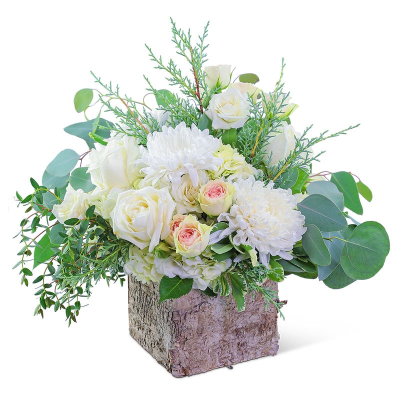 Awaken the senses as you walk into your own romantic floral fantasy! Traditional roses, contemporary mums, and playful hydrangea mix to create a stunning bouquet! Blushing in Birch is bursting with blossoms and arranged in an eye-catching birch cube, accented with premium foliage. A shop favorite, this timeless beauty is perfect for any occasion!