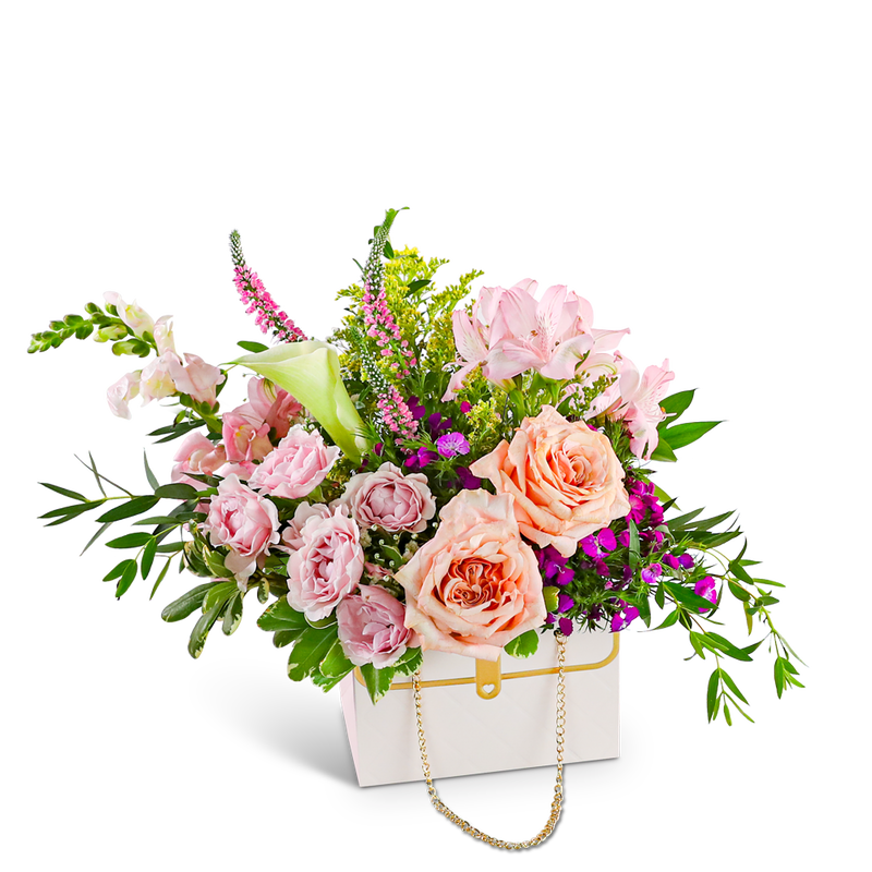The Botanical Bliss Clutch is a stunning floral design that captures the beauty of wildflowers in a chic way. Featuring mini Calla lilies, Roses, Alstroemeria, Snapdragons, and lush foliage, this handbag arrangement creates a mesmerizing and natural appeal. With its timeless color palette and fashionable flower box purse, it's not just a floral display but a versatile keepsake container that adds elegance to any setting. As a trusted local florist, we take pride in every order, offering hand-crafted flower designs delivered directly to the recipient. Our flower shop is committed to providing the highest quality, freshest flowers, and ensuring timely delivery for every arrangement.