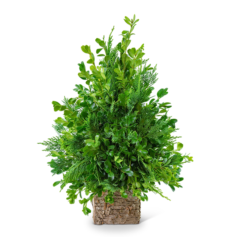 Bring the outdoors inside with this arrangement of boxwood and white pine displayed in a rustic birch box. Boxwood Simplicity Tree is beautiful as is but can also be decorated for a seasonal or holiday display on any tabletop. This is not a live tree but will stay fresh for several weeks with regular watering.