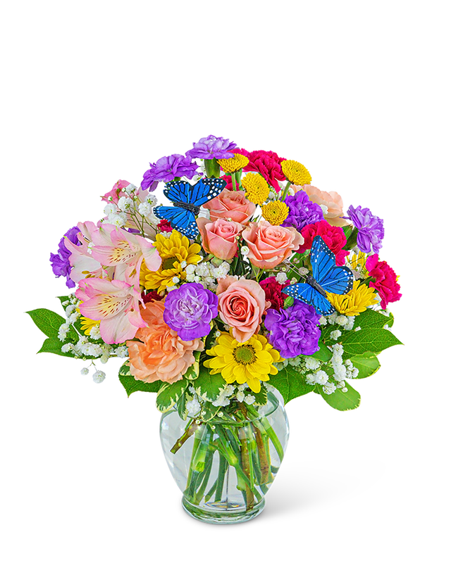 What could be more cheerful and fun than a collection of vibrant fresh flowers in a classic round design? Send some cheer today! A collection of daisies, carnations, spray mums, Alstroemeria, and baby's breath, adorned with a silk butterfly. Local flower delivery is our specialty, so order today!