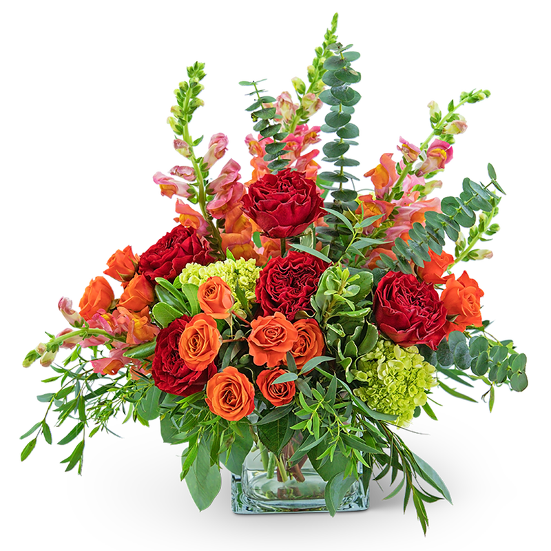 With its deep reds, oranges, and pinks, this arrangement is as stunning as it's namesake. Capri Sunset features roses, snapdragons, hydrangea, pittosporum, eucalyptus, and parvifolia. No matter what the occasion, this bouquet will add just the right touch of warmth!