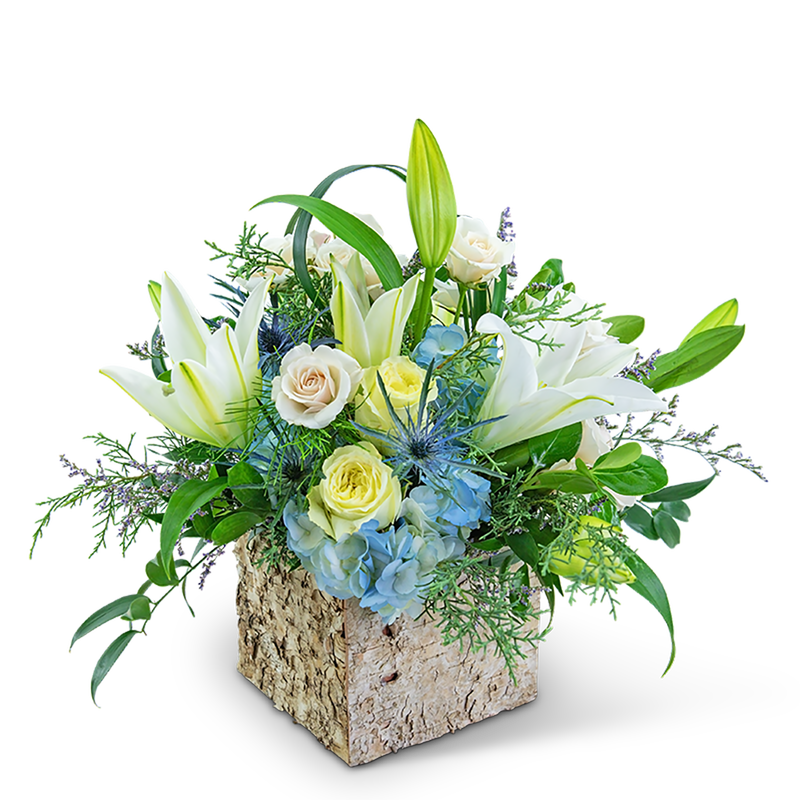 Wouldn't it be heavenly to receive this arrangement of soft blues and whites? Celestial Beauty features blue hydrangea, white roses, blue eryngium, lily grass, evergreen, limonium, and Italian ruscus in a charming birth box. This tranquil arrangement is perfect for a new baby, get well or just because gift.