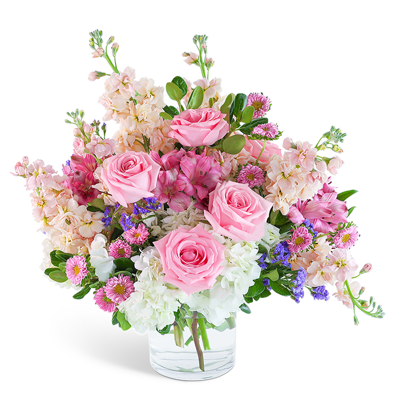 Spread love and joy with our exquisite Celestial Cloudscape flower design. Delicate pink roses, Alstroemeria, and Hydrangea are artfully arranged in a clear glass vase, creating a beautiful and tender look that is sure to bring a smile to anyone's face. With its pop of pastel colors, this unique flower arrangement is perfect for adding a touch of soft elegance to any occasion. Our floral inventory changes with the seasons and market availability. These images are indicative of our general size & style. We can offer same-day flower delivery in most cases. If you are sending the bouquet directly to your recipient, please provide the complete address and contact information so that we can deliver the flowers directly to them.