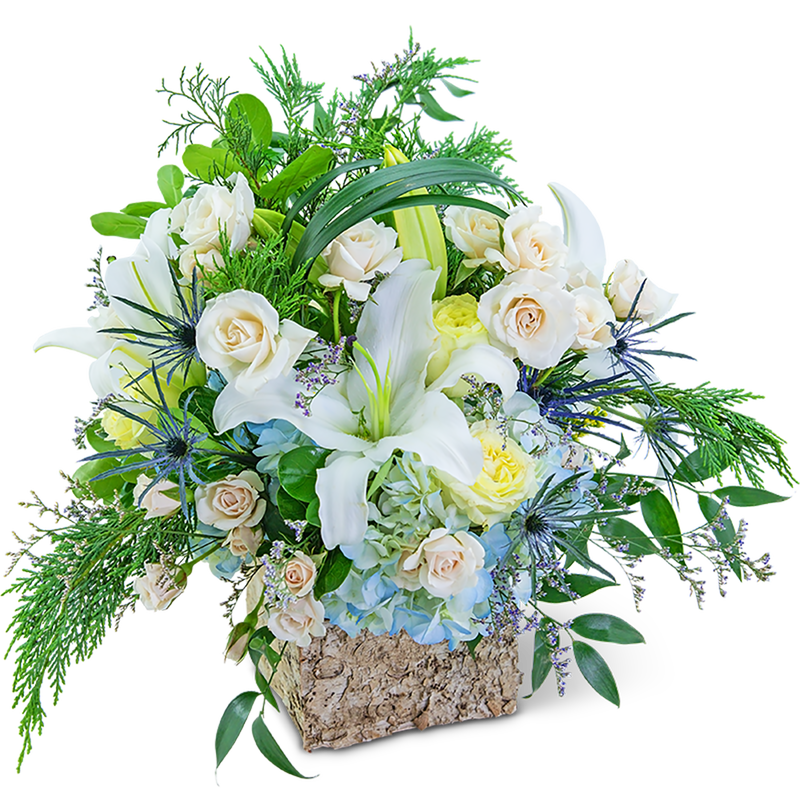 Wouldn't it be heavenly to receive this arrangement of soft blues and whites? Celestial Winter features blue hydrangea, white oriental lilies, blue eryngium, white roses, lily grass, evergreen, limonium, pittosporum, and Italian ruscus in a charming birth box. Whether for a birthday, anniversary, or thinking of you gift, this will look perfect on an entryway or dining room table.