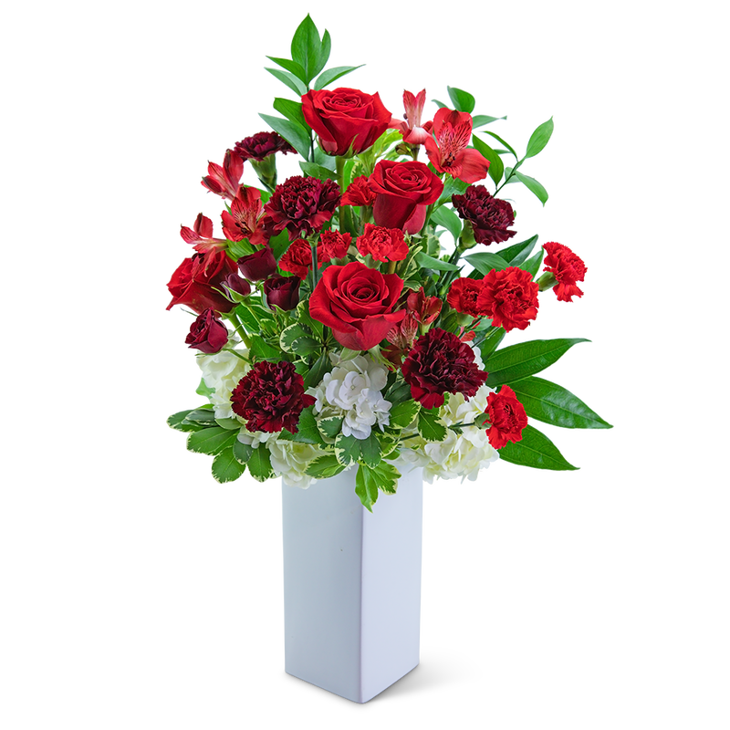What a treat it would be to receive this stunning bouquet! Cherry Cheesecake features roses, hydrangeas, alstroemeria, and carnations surrounded by a variety of foliage in a tall white vase. This stylish arrangement will make quite a statement on any entryway or dining room table.