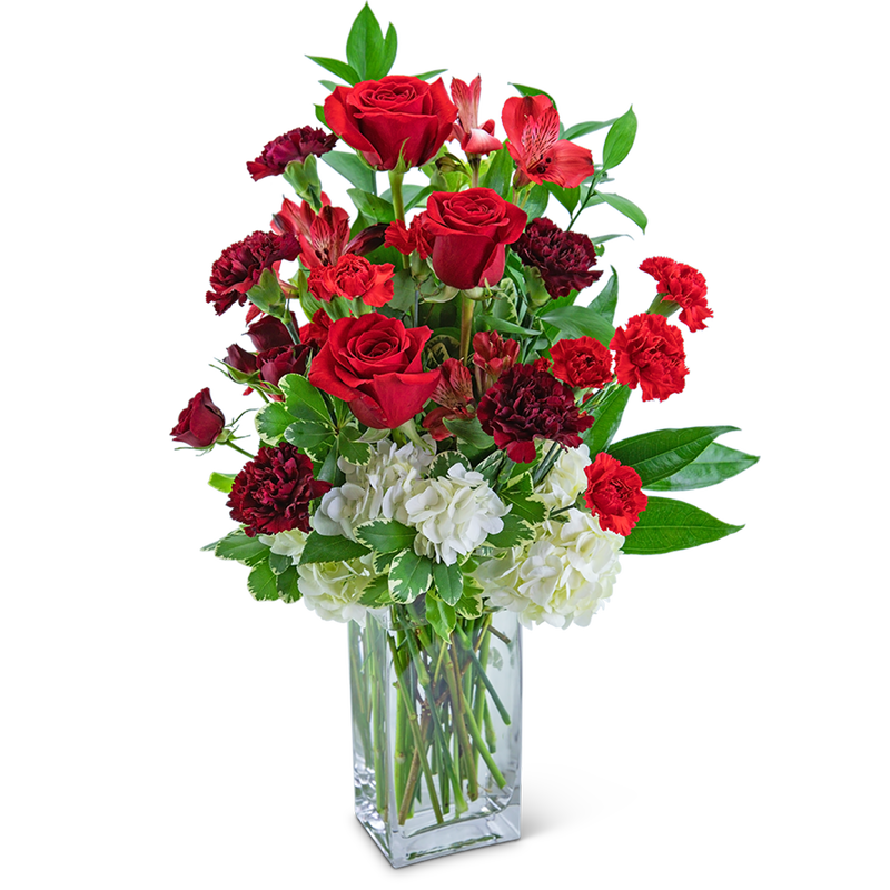 What a treat it would be to receive this stunning bouquet! Cherry Tart features roses, hydrangeas, alstroemeria, and carnations surrounded by a variety of foliage in a tall clear vase. This stylish arrangement will make quite a statement on any entryway or dining room table.