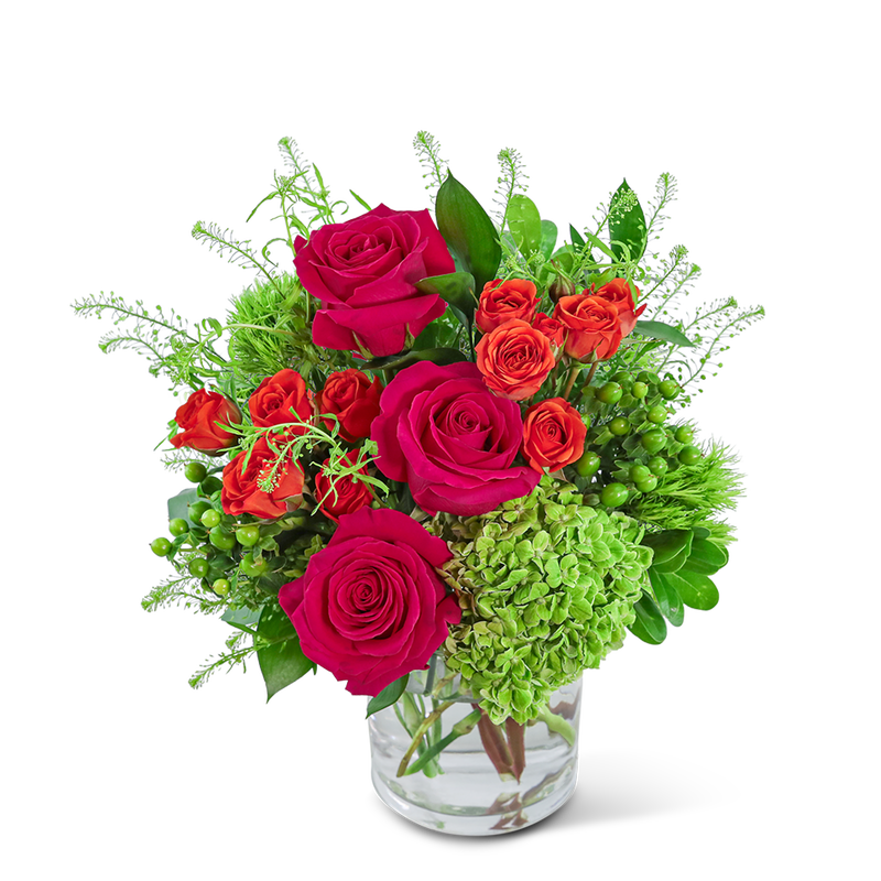 Chic Citrus Blooms will bring a burst of vibrant energy with its exquisite combination of hot pink, orange, and green hues. This stunning floral arrangement, set in a clear vase, features a blend of Roses, Green Trick Dianthus, Hydrangea, and Hypericum Berry, accented with premium foliage. It makes the perfect birthday or get-well gift, with its cheerfulÊcharm.