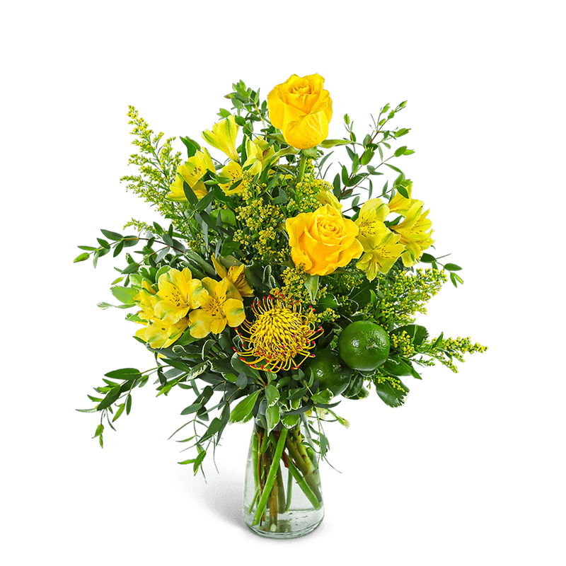 Citrus Zest is a bright and refreshing arrangement featuring Roses, Alstroemeria, Pincushion Protea, Solidago, and premium greenery, accented with zesty limes. Designed in a clear glass vase, it brings a burst of energy and sunshine to any setting. Our floral designer may make thoughtful substitutions as needed to preserve the overall look and feel.