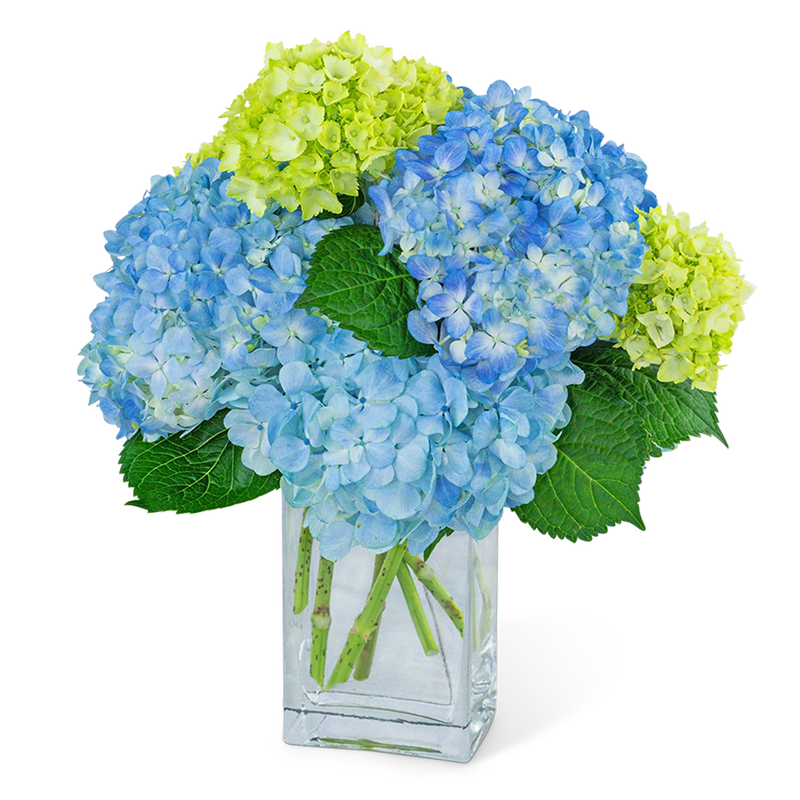 A beautiful bouquet with Hydrangeas is a classic and timeless flower arrangement for any occasion. Coastal Calm simply features beautiful blue and mini green Hydrangeas in a clear vase. Our Floral Shop specializes in local flower delivery, so let us make someone's day with our beautiful Hydrangea bouquet delivered right to their front door or office.