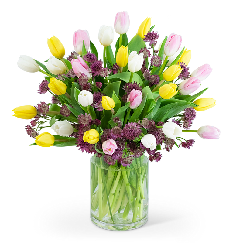 This fun design is perfect for a birthday, anniversary, or get well gift. The Confetti design features multi-colored tulips and pops of lavender astrantia in a large glass vase. It would also be a great party centerpiece and would fit nicely on a dining room table!