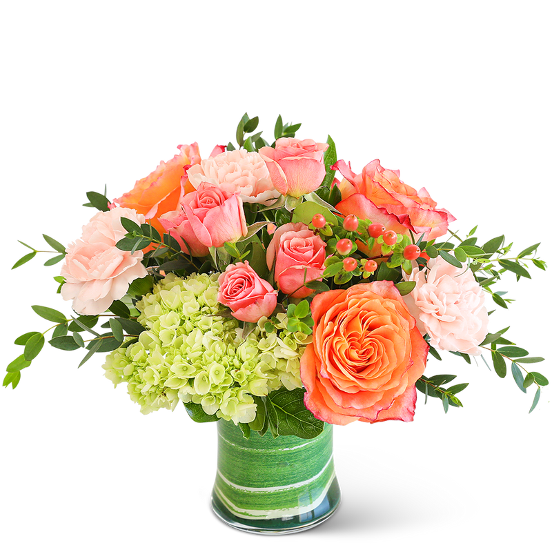 Send a message of love and calm with this beautiful flower arrangement. Brighten someone's day with the creatively designed Coral Calma flower arrangement. Its highlighted flowers include Free Spirit Roses, carnations, hydrangea, spray roses, and assorted foliage. A stunning arrangement of fresh flowers is designed to brighten the room and lift the spirit, making someone's birthday or get-well gift extra special.