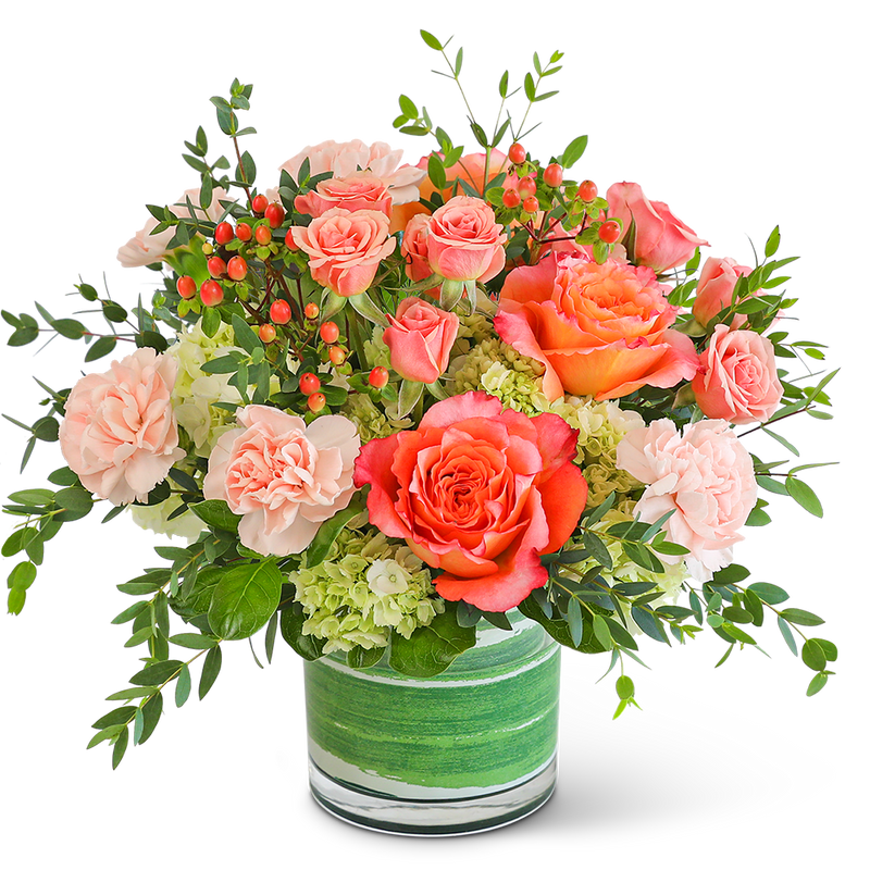 Send a message of love and hope with this beautiful flower arrangement. Brighten someone's day with the creatively designed Coral Revival flower arrangement. Its highlighted flowers include Free Spirit Roses, carnations, hydrangea, spray roses, and assorted foliage. A stunning arrangement of fresh flowers is designed to brighten the room and lift the spirit, making someone's birthday or get-well gift extra special.