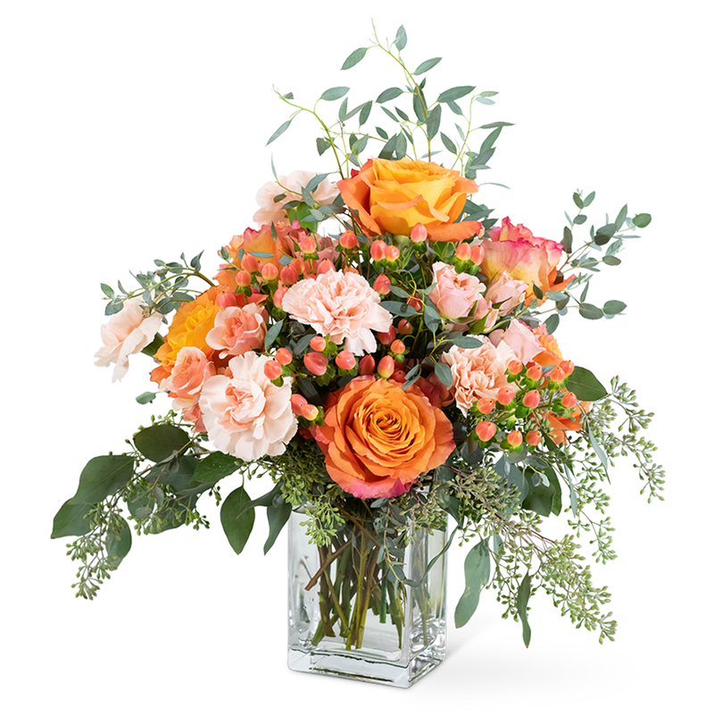 This floral masterpiece takes beauty to a new level. The unique Free Spirit Roses, along with peach carnation, hypericum berries, peach spray roses, and different varieties of eucalyptus are so beautifully arranged, it might as well be a symphony! Coral Symphony would be an ideal gift for all occasions or celebrations.