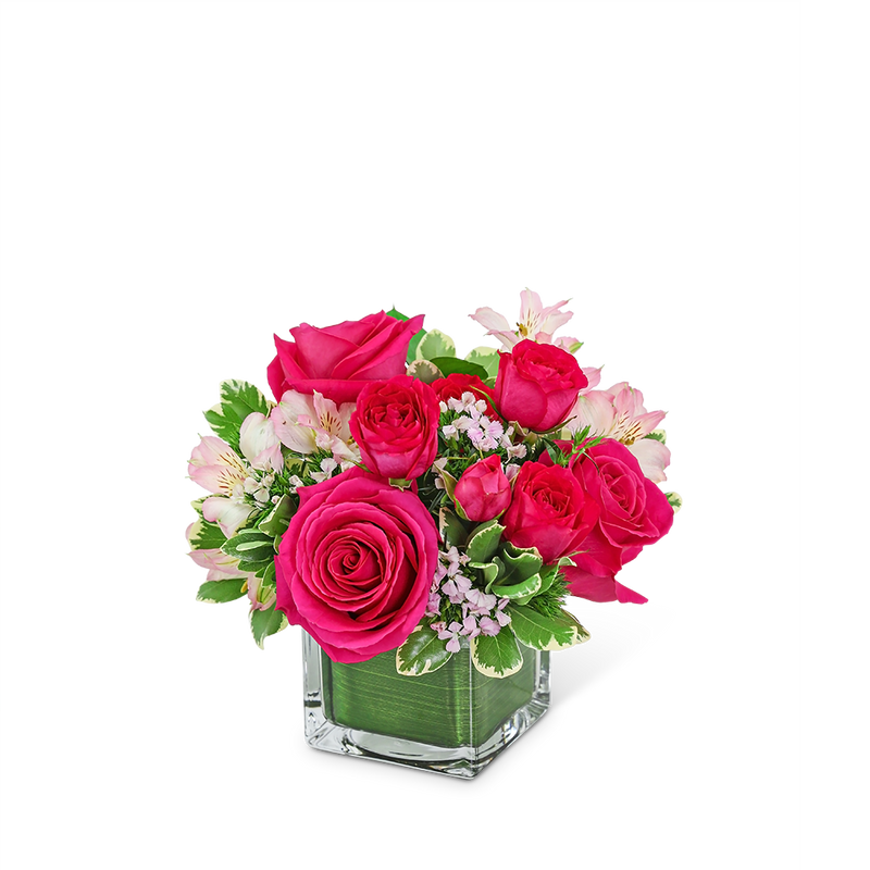 If you're looking for an easy way to brighten someone's day, this is it! Cosmo Cutie has a combination of bright pink roses, alstroemeria, and beautiful fresh foliage in a leaf-lined vase. This chic bouquet will light up any room or space and is the perfect gift for any occasion.
