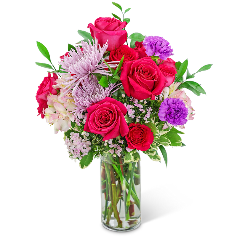 If you're looking for an easy way to brighten someone's day, this is it! Cosmo Kiss has a combination of bright pink roses, carnations, alstroemeria, and beautiful fresh foliage in a clear vase. This chic bouquet will light up any room or space and is the perfect gift for any occasion.