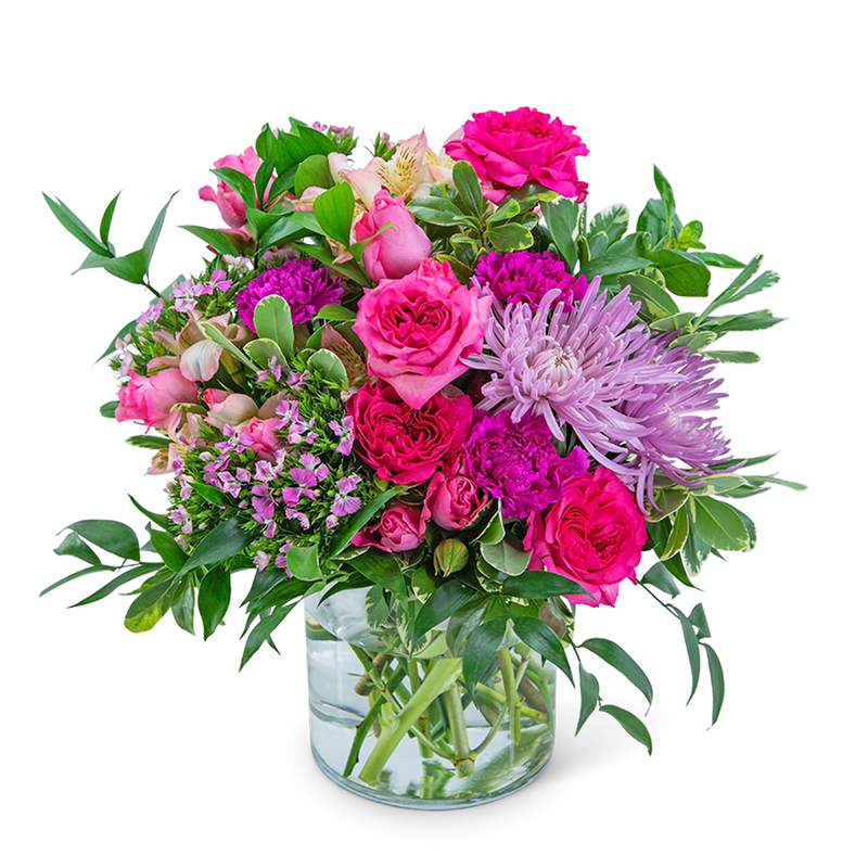 Who wouldn't like to receive this fantastic arrangement? Cosmopolitan Jungle features Pink roses, stem spray roses, dianthus, alstroemeria, spider mums, carnations, ruscus, and pittosporum in a clear vase. This would be a sweet gift for an anniversary, birthday, or any occasion and will look perfect on an entryway or dining room table.