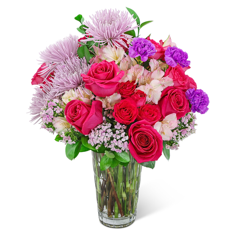 If you're looking for an easy way to brighten someone's day, this is it! Cosmopolitan Star has a combination of bright pink roses, carnations, alstroemeria, and beautiful fresh foliage in a clear vase. This chic bouquet will light up any room or space and is the perfect gift for any occasion.
