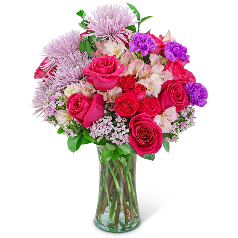 If you're looking for an easy way to brighten someone's day, this is it! Cosmopolitan Wish has a combination of bright pink roses, carnations, alstroemeria, and beautiful fresh foliage in a clear vase. This chic bouquet will light up any room or space and is the perfect gift for any occasion.