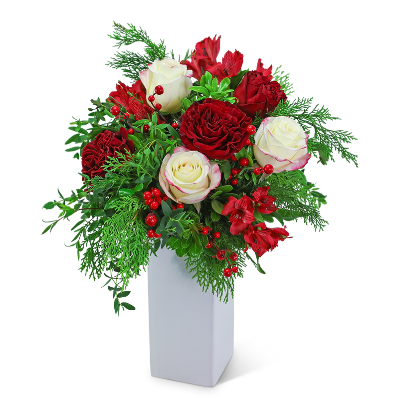 The rich, romantic colors of Cozy Wonderland are sure to melt the heart of your loved one. Beautiful ruffly roses, alstroemeria, and other premium flowers and winter foliage are artfully arranged in an on-trend white vase. Flower delivery has never been easier or more appreciated. Whether you are looking for a birthday, anniversary, or valentines day gift, we have flowers that are sure to fit the occasion!