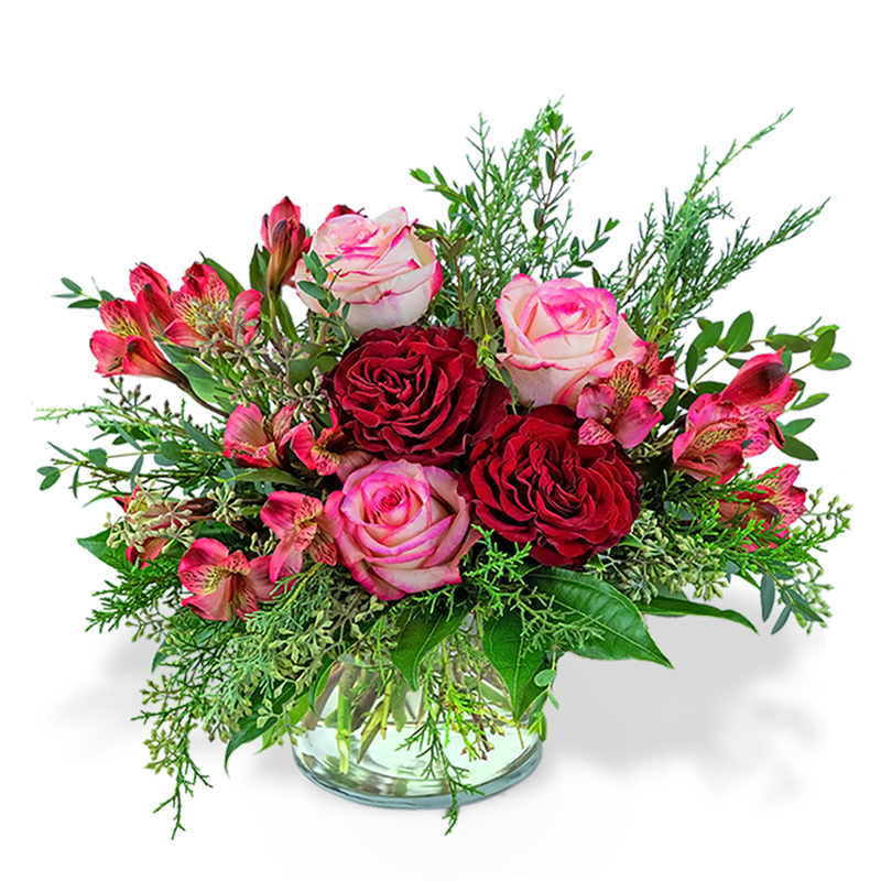 Cranberry Rose is the perfect winter flower design for your home. It will look nice on any holiday table, with an assortment of roses, Alstroemeria, Eucalyptus, and assorted Evergreen. Cranberry Rose is a shop favorite, with its rich, warm, cranberry tones.