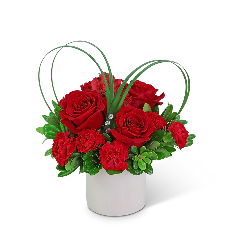 Cross My Heart is a very romantic gift! This fresh flower design is created with roses, alstroemeria, and carnations in a white vase. Whether you're looking for a gift for your Valentine or just to show someone how much you care, this design made up of all red blossoms with a natural foliage heart accent makes it an exceptional gift for Valentine's Day. Whether you're looking for a gift for your Valentine or just to show someone how much you care, this romantic bouquet will surely convey your feelings.