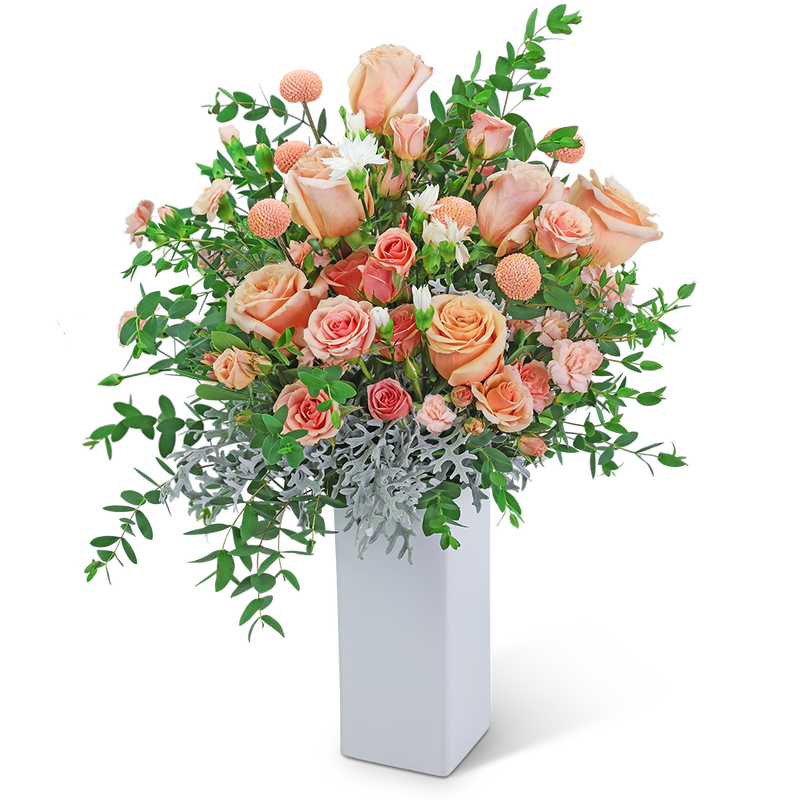Our Dancing Peach Blossoms design is a sweet way to show someone you care. Delicate peach roses bring life to this arrangement, as Carnations, Crespedia, and other premium flowers and foliage fill it out beautifully. If you're looking for a stunning birthday or anniversary gift that really expresses your love, look no further than our Dancing Peach Blossoms design.