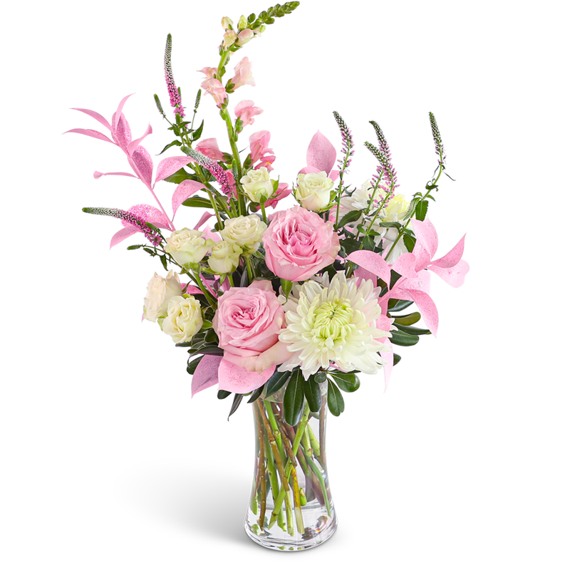Dancing Through Life is a magical floral design exuding charm in a pink and white color palette. The exquisite pairing of roses, Cremons, Snapdragons, and glitter pink foliage creates a captivating display. Presented in a clear glass vase, this enchanting flower design is perfect for adding a touch of sparkle to any space. Elevate the magic by arranging a flower delivery, allowing us to bring this enchanting creation straight to your doorstep. As a trusted local florist, we take pride in every order, offering hand-crafted flower designs delivered directly to the recipient. Our flower shop is committed to providing the highest quality, freshest flowers, and ensuring timely delivery for every arrangement.