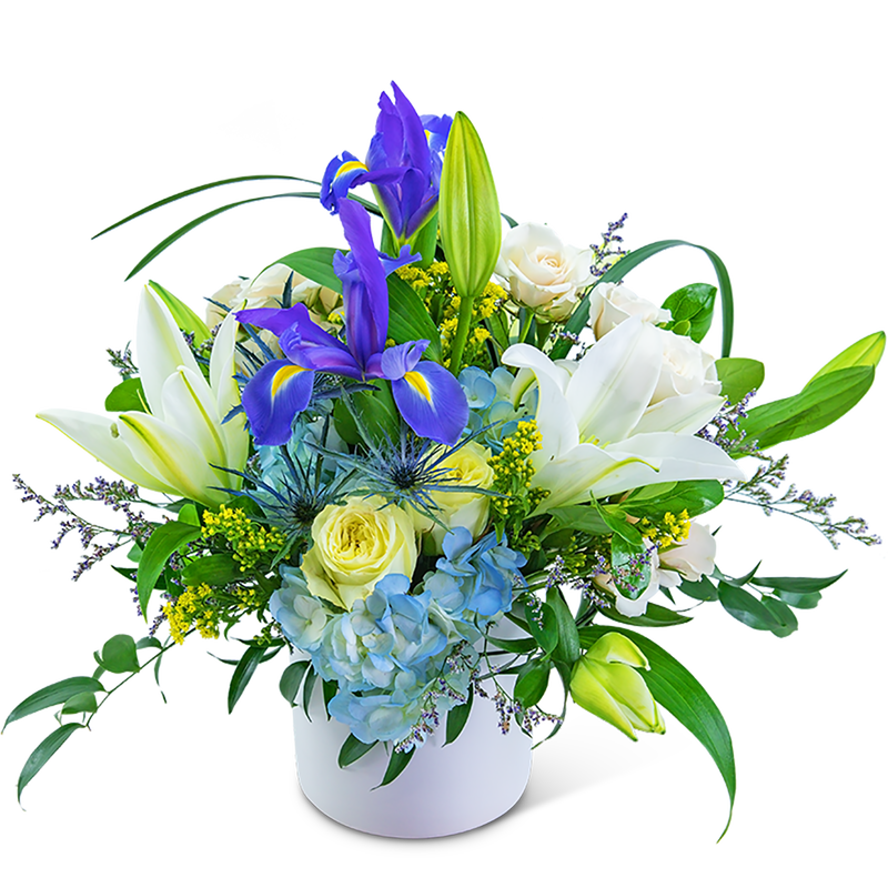 The soft blues and whites of this bouquet are as calming as a new day. Daybreak features blue hydrangea, white oriental lilies, blue eryngium, white roses, iris, lily grass, solidago, limonium, and Italian ruscus in a white ceramic container. This stunning arrangement will add a touch of tranquility to any room and look perfect on an entryway or dining room table.