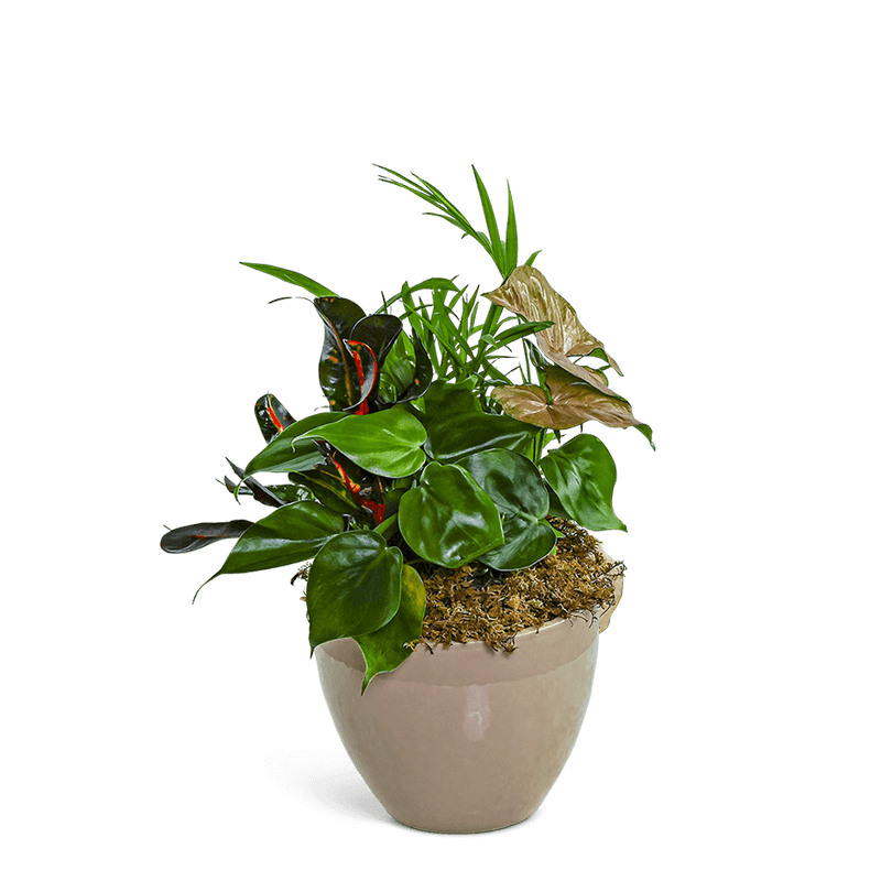 This Dish Garden in Taupe Ceramic features a fresh mix of leafy green plants in a simple, modern container. It's a great choice for adding a natural touch to any home or office. Plant varieties may vary slightly with the seasons.