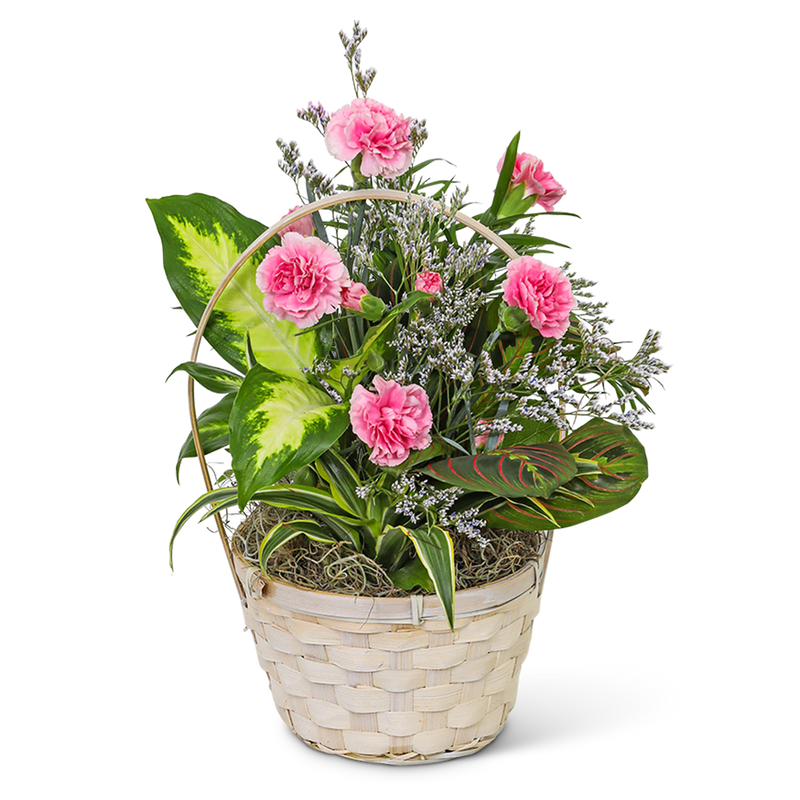 Our Dish Garden with Petite Pink Florals is the perfect choice for anyone who loves both flowers and plants. With a variety of textures and colors, this dish garden is sure to brighten up any room. This beautiful dish garden features a variety of green plants, fresh pink mini carnations, and limonium, all arranged in a stylish woven basket. Whether you're celebrating a special occasion or want to send your sympathy, our Dish Garden with Petite Pink Florals is a perfect choice.