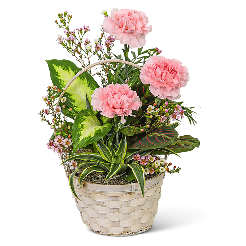 Our Pink Floral Dish Garden is the perfect choice for anyone who loves both flowers and plants. With a variety of textures and colors, this dish garden is sure to brighten up any room. Plus, with proper care, these plants can thrive for years to come. To keep your dish garden healthy and happy, be sure to place it in a bright, indirect light and water it regularly, allowing the soil to dry out slightly between waterings. Whether you're celebrating a special occasion or just want to show someone how much you care, our Pink Floral Dish Garden in a Basket is the perfect choice.
