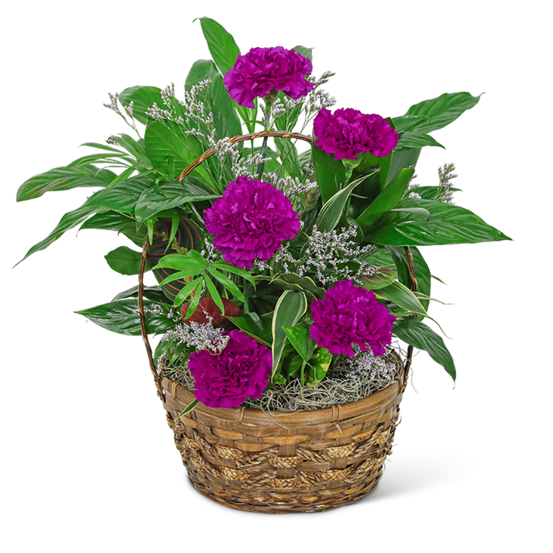 This beautiful dish garden features a variety of green plants, as well as purple carnations and fresh limonium to add a pop of color. Whether you're celebrating a birthday, sending a sympathy gift, or just want to brighten someone's day, our Dish Garden with Purple Florals is a perfect choice! As a local florist offering flower and plant delivery services, we're proud to provide our customers with the highest quality products and customer service.